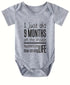 Celebrate your baby's milestone with our "Just Did 9mos On the Inside" onesie! This grey onesie with snap closure features a humorous message and a cute design. Show off your sense of humor and pride in your little one's development. A perfect gift for new parents.