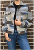 This stylish jacket features a classic gray base fabric, with a subtle blue and brown Aztec print, and fastens up the front with buttons. Crafted with care, this jacket is perfect for everyday style with a touch of classic elegance.