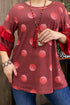 This burgundy blouse features a polka dot print and ruffled sleeves, providing a fresh, stylish look for any wardrobe. The lightweight fabric and three- quarter sleeve design ensure a comfortable fit for all occasions.
