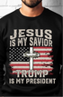 Show off your beliefs and political support with this bold graphic tee! Featuring a clever play on words, this tee proudly declares Jesus as your savior while also showing your support for President Trump. Perfect for casual wear or political rallies.