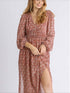 Sheer Floral Print Long Sleeve Smocked V-Neck Maxi Dress with Side Slits and Lining