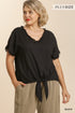 Women’s Oatmeal or Black color Linen Blend V-Neck Short Sleeve Frayed Hem Detail Top with Front Tie-able Knot.